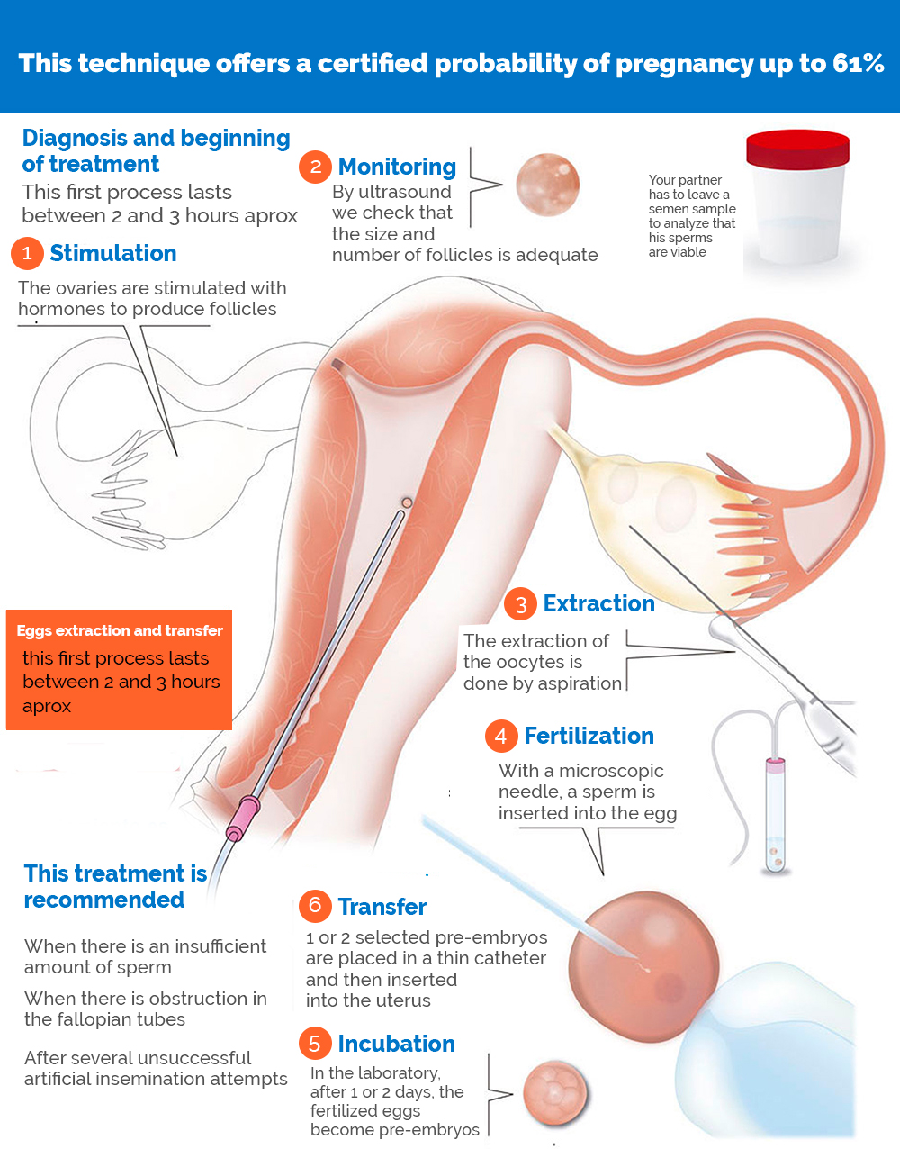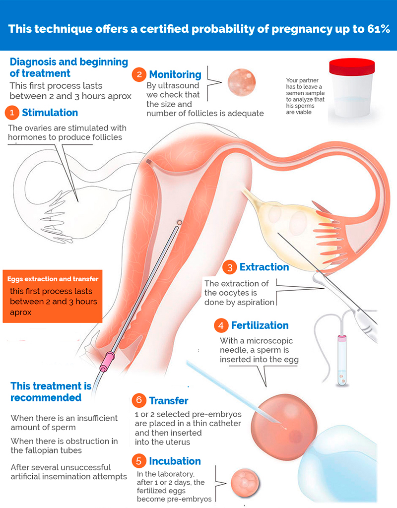 In Vitro Fertilization with eggs and sperm from the couple is a laboratory technique that fertilize the previously extracted eggs with your partner´s own sperm. This technique offers a certified probability of pregnancy up to 61%.. Once Fertilized, the eff becomes a pre-embryo and it´s inserted into the uterus for futher development. Typically, in normal menstrual cycle, only one egg develops each month. For a In Vitro Fertilization, we need to obtain more than just obe egg, so it is necessary to stimulate the ovaries hormonally to get several mature eggs at the same time.